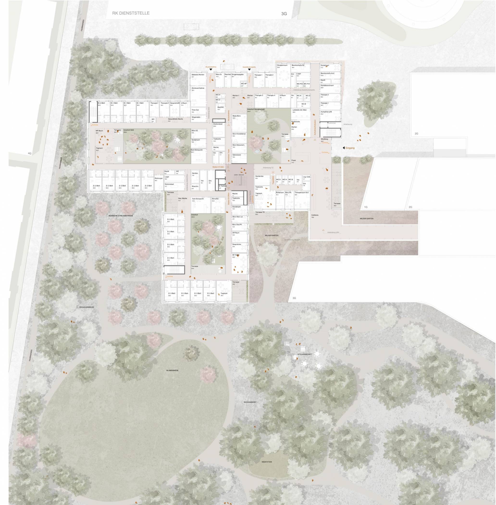 Die Tagesklinik liegt bewusst im Erdgeschoss, damit sie unkompliziert erreichbar ist und damit sich die besten Synergien und Nutzungsmöglichkeiten der Parkanlage ergeben.