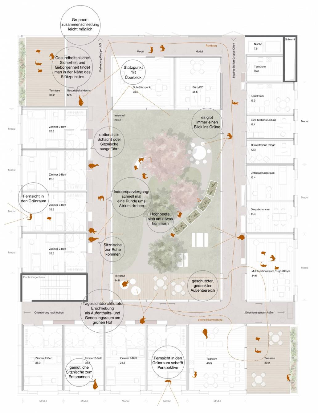 Es wurde bewusst auf eine zweihüftige Gangerschließung verzichtet. Verlässt der Patient oder die Patientin das Zimmer, so erwartet Sie, kein Gang, sondern ein umschließendes Atrium mit Tageslicht und stimmungsvollen Grünraum. Um das grüne Atrium kann man auch schnell mal eine Runde drehen, ohne die Station verlassen zu müssen. Der Rundweg dient als erweiterter halbprivater Lebens- und Genesungsraum, mit zusätzlichen atmosphärischen, qualitätsvollen Aufenthaltsbereichen und Rückzugsnischen. Nutzungsüberlagerungen werden zur Selbstverständlichkeit.