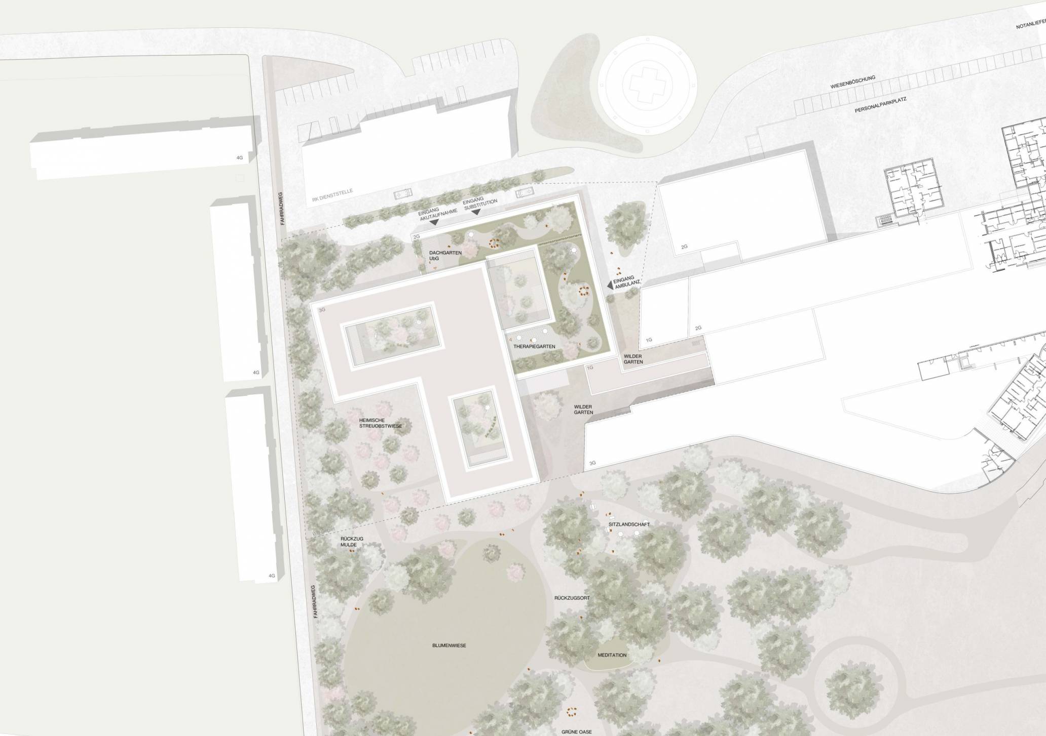 Die Patientinnen haben die Möglichkeit die grünen Höfe selbstbestimmt zu betreten, um ein Gefühl von Stärke und Freiheit über das eigene Leben wiederaufzubauen. Gleichzeitig bietet dieser spezielle Grünraum auch heilsamen Schutz und Sicherheit.