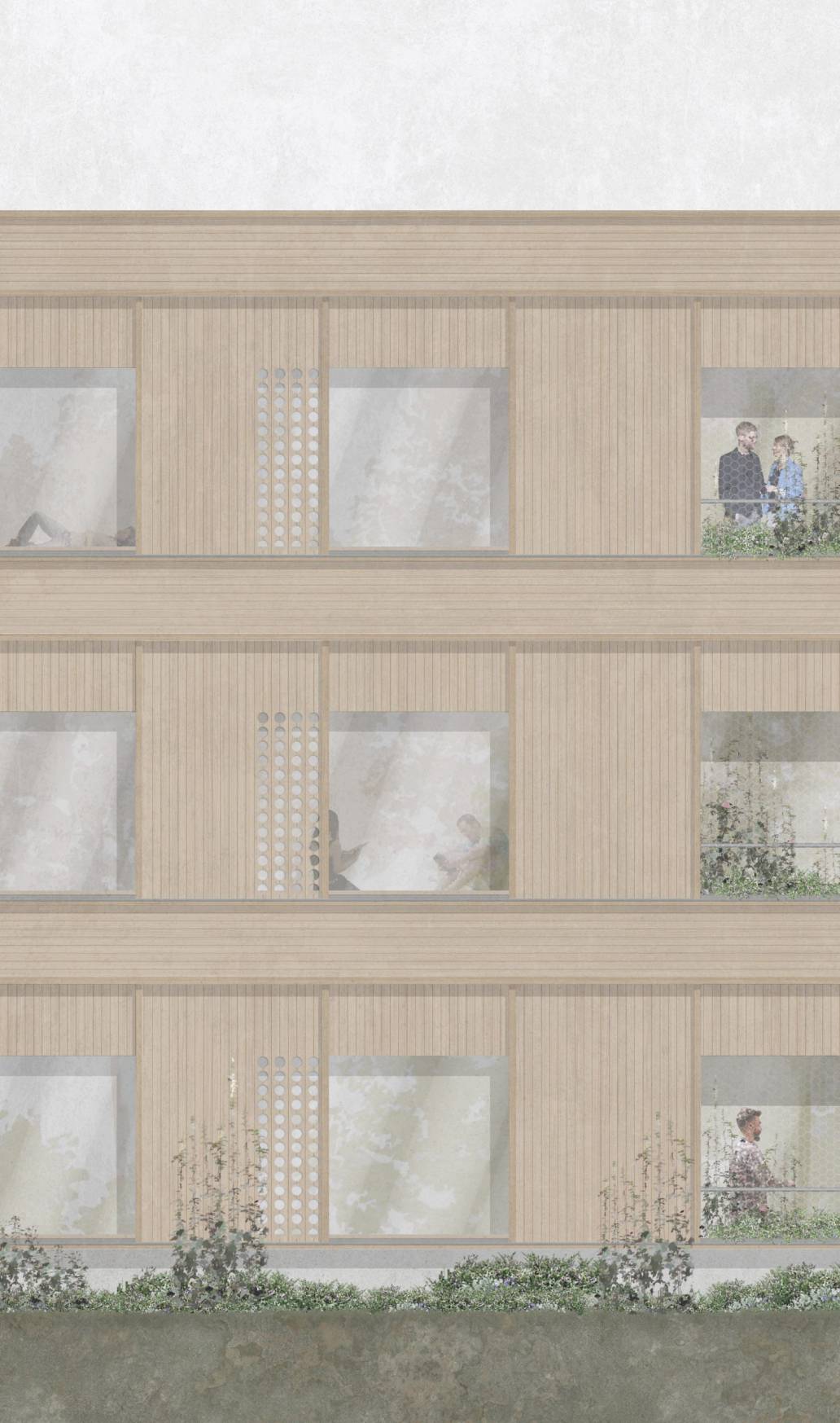 Die Grundrisse zur Wohnbebauung sind so organisiert, dass sich zu dieser keine Aufenthaltsbereiche sowie Zimmer befinden. Eine vorgelagerte Erschließungsfläche mit perforierter Fassade dient noch zusätzlich als Filter.