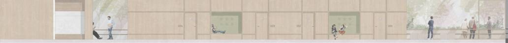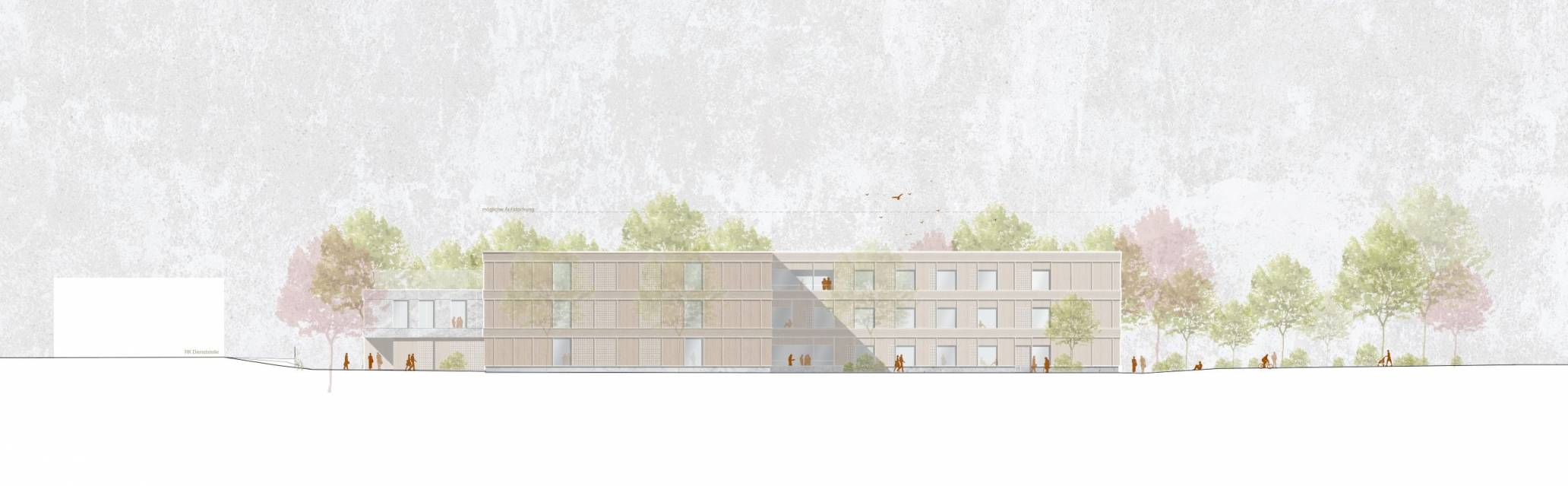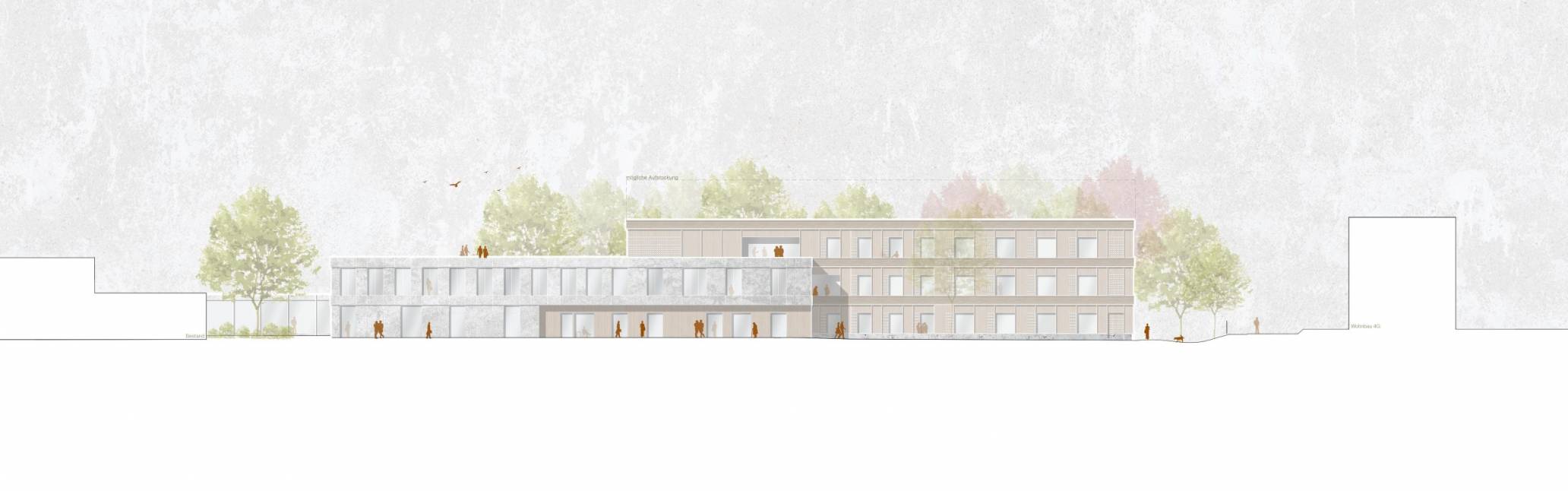 Die Gestaltung der äußeren Hülle bzw. der Fassade zielt auf die Gliederung in einfach erfassbare Volumen für die Patienten und Patientinnen ab. Das Therapiegebäude mit den allgemeinen Bereichen, differenziert sich in der Fassadengestaltung von den Stationsgebäuden, zum einen um die Funktion ablesbar zu machen und zum anderen um einen „weichen“ Übergang von den Oberflächenqualitäten des Bestandes zu den natürlichen Holzoberflächen der Stationsgebäude zu schaffen. Alle Fassadenrücksprünge im Therapietrakt die geschützte und überdachte Aufenthalts-, oder Zufahrtsbereiche beinhalten, sind auch im Therapiegebäude in Holz ausgeführt, um körpernahe Oberflächen eine angenehme Haptik zu geben, aber auch um die materielle Überleitung zu den Stationsgebäuden mit reinen Holzfassaden zu gewährleisten.