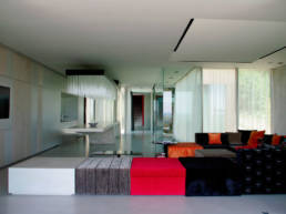 Der Grundriss ist so gestaltet, dass alle Funktionen des Wohnens auf einem Geschoß organisiert sind. Lediglich das Gästezimmer und Nebenräume befinden sich im Sockelgeschoß. Auf der Panoramaebene über dem Hauptgeschoß thront ein repräsentativer Loungebereich, der sich ebenfalls auf beide Seiten öffnet. Dieser Relaxbereich ist auf allen Flächen modulartig mit gepolsterten Möbelelementen ausgekleidet. Das Farbspektrum stellt Assoziationen zu den 70er Jahren her.