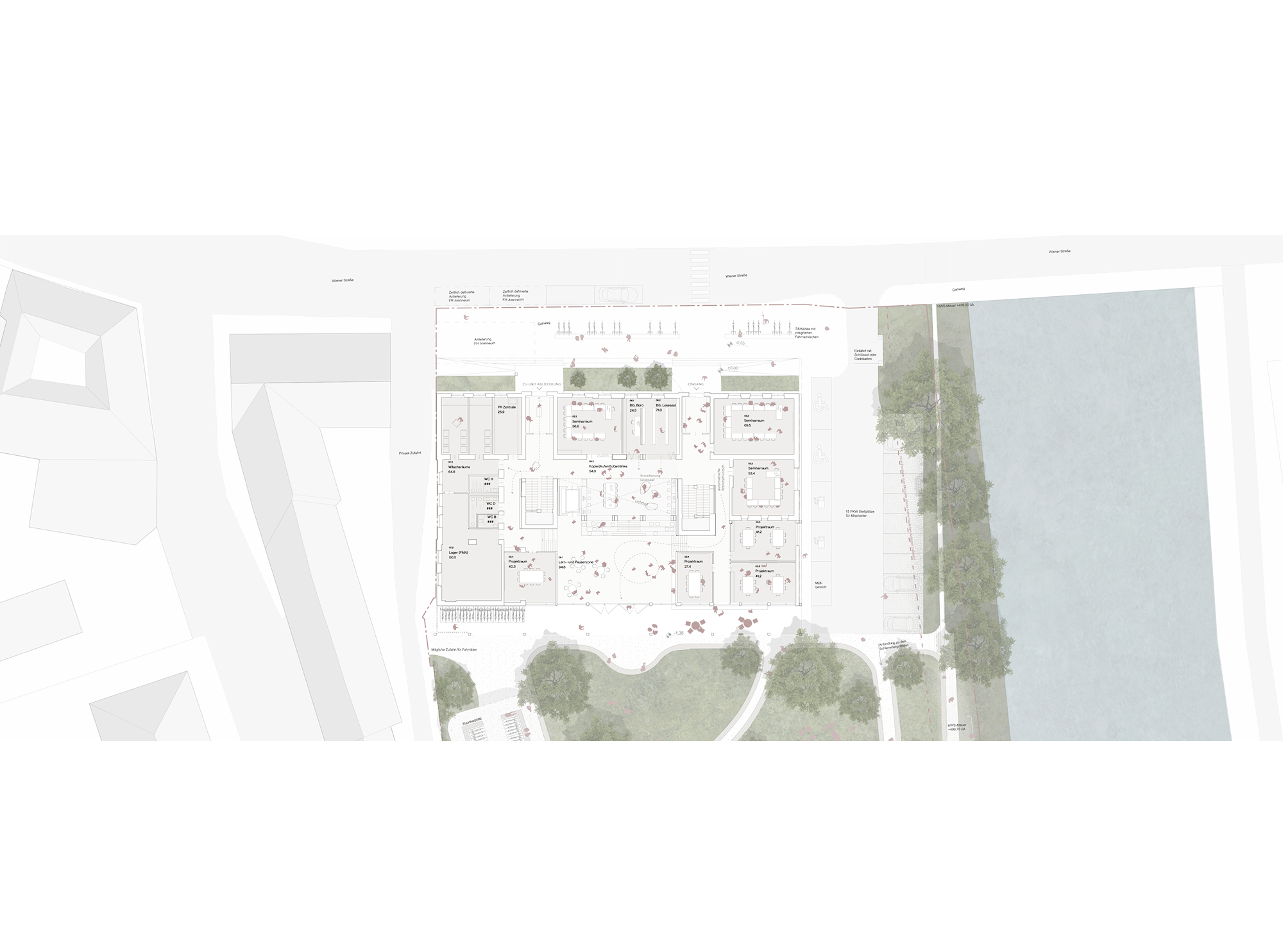 Das „Hinten“ ist geprägt vom Landschafts- und Grünkörper. Die Mürz und ihr begleitender Uferraum bestimmen die Atmosphäre des Ortes. Der Uferraum wird so gestaltet, dass er erlebbar und zugänglich wird und den Studierenden und Mitarbeitern einen unvergleichlichen Erholungsraum bietet. Dort wo die Autos parken, wird eine Stützmauer, die gleichzeitig Sitzbank ist, errichtet und Schutz vor Hochwasser bietet. Der vorgelagerte Park bietet den Radfahrern auch einen Pavillon an, um witterungsgeschützt das Fahrrad abstellen zu können. Am Pavillon umlaufend ist eine Sitzbank, die ebenfalls zum Studieren an der frischen Luft einlädt. Rad- und Flanierweg werden bis zur Bahn nach Westen weitergeführt, um eine Durchwegung aus allen Richtungen zu gewährleisten. Der Grünraum ist im Kontrast zur Geometrie des Gebäudes in seiner Formensprache sehr weich und gelassen. Da dem „Hinten“ durch die Addition eines neuen Baukörpers eine neue Rolle zukommt, kann auch hier das Gebäude bequem und barrierefrei erschlossen werden. Eine raumhaltige Fassade leitet wieder vom Öffentlichen ins Private über.