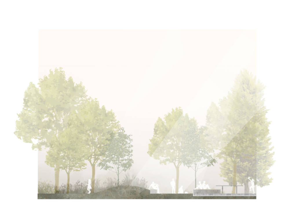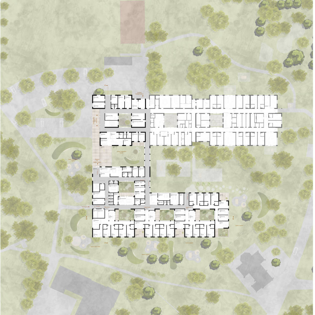 Deshalb ist das bestimmende bedürfnisorientierte Gestaltungselement die Natur bzw. der Grünraum, um insbesondere der Affinität psychisch kranker Menschen zu Pflanzen und Bäumen gerecht zu werden. Durch die Präsenz von Natur im und um das Gebäude, wird ein Entspannungsreflex ausgelöst und somit das Stressniveau gesenkt.