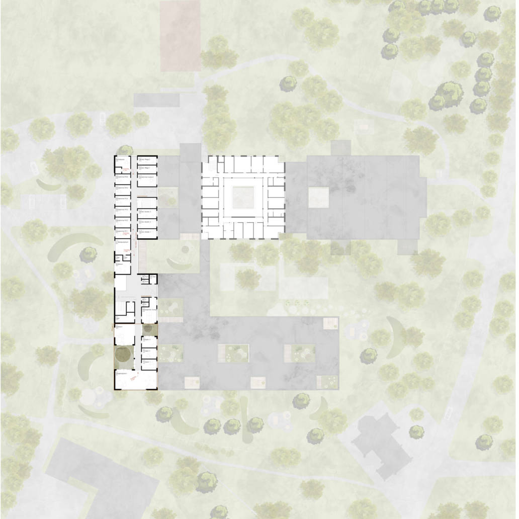 Der Zubau wird so platziert, dass ein Maximum an großflächigen zusammenhängenden Grünraum bestehen bleibt. Grüne Höfe sorgen dafür, dass alle Erschließungswege immer von stimmungsvollen Grünräumen im Wechsel der Jahreszeiten begleitet werden. Der Wert der Natur für den Patienten ist somit immer gegenwertig.