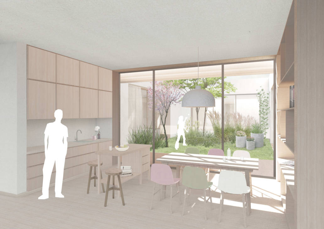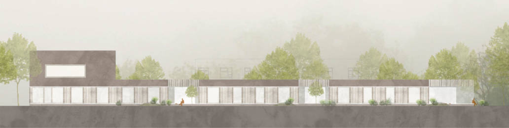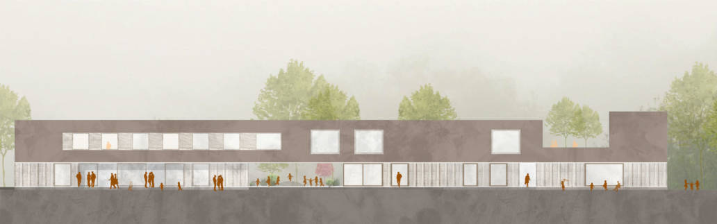An den Hof angelagert, sind helle Dienst und Visitenzimmer, mit wohltuendem Blick in den Garten, der therapeutische Beziehungen erleichtern soll. Die Gestaltung der äußeren Hülle oder der Kubatur zielt auf einfach erfassbare Volumen für den Patienten ab. Die Eingangssituation ist durch den Rücksprung in der Fassade eindeutig. Die Geschosse sind durch einen Materialwechsel sofort erkennbar. Das Erdgeschoss an dem sich die Patienten entlang bewegen, erhält eine warme haptische Holzfassade. Das Obergeschoss wird als integrative, der umgebenden Gebäude geschuldete Putzfassade ausgeführt, gleichzeitig ist es auch der Teil der mit dem Bestand eine verbindende Einheit schafft. Die Putzfassade ist als Kellenwurf, in der Oberfläche sehr „körnig“ und in der Wirkung sehr haptisch vorgesehen, um dem Gebäude einen spezifischen Charakter zu verleihen.